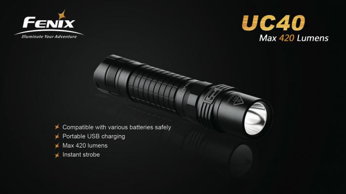 Подобно на флашка,фенера се зарежда и се ползува.Fenix UC40 е едно USB акумулаторно фенерче.Може да ползува безопасно и различни видове батерии.Така,че ако не разполагате с USB изход ползвайте батерии.Това е широкообхватен фенер за осветление при колоездене,къмпинг,катерене,туризъм и др.